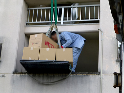 エレベーターなしでしたので、クレーンでの荷物上げ作業中です。