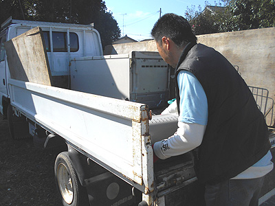家電リサイクル対象の冷蔵庫回収処分の積み込みです。
