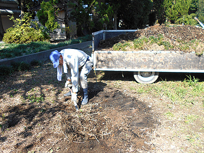 三根町の神社境内の一角にある排土や残土などの回収作業です。