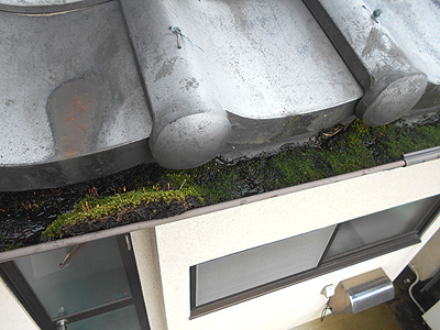 屋根の雨樋に土砂や不純物が堆積して塞がり