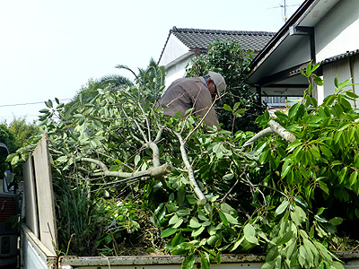 そのあと高所作業車で庭木の枝打ち作業をし