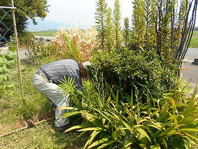 庭周りの雑草と剪定作業ですが、連日の暑さの中