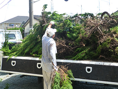 庭木の貝塚を伐採し、トラックで2台分相当量の積込みをしており、