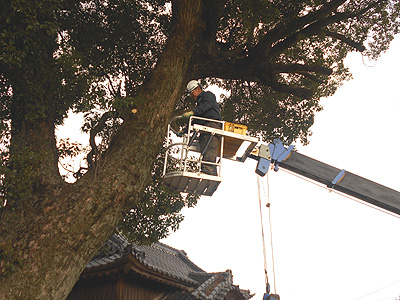 上峰町の神社境内で繁殖が著しい樹木の枝打ち