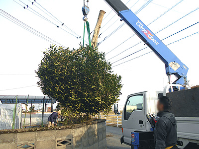 周囲が狭く、切り落とした枝を一旦クレーン車で吊り上げて