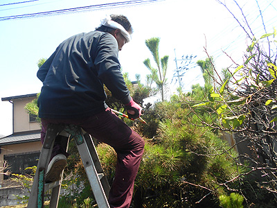 雄松の芽を摘み、根気の要る作業です。