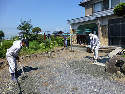 庭先周りに砂利の敷設作業で石材加工場より直接搬入です。