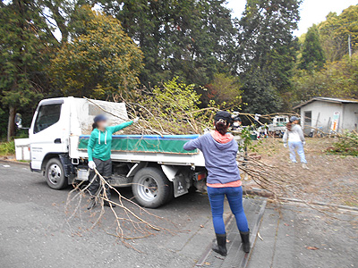 上から切り倒した雑木をトラックで積み込んで