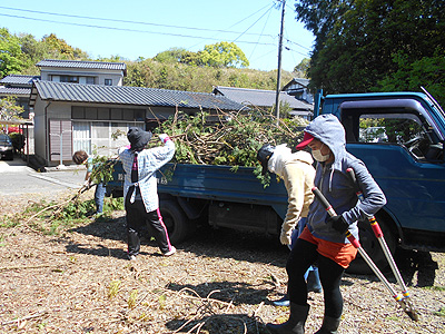 切り倒した枝木を、依頼者の地元の方々と一緒に