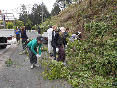 枝木を集約し、法面の上から応援部隊で回収しています。