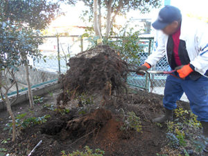 H30年12月17日(月) 庭木の伐根作業です。 クレーンで吊り上げて、切り株の周りの土を綺麗に落とします。 他に五本ほど伐根し、作業が終わったあとは庭がスッキリとしました。 不要な庭木の抜根、枝打ち剪定、除草作業など、 […]
